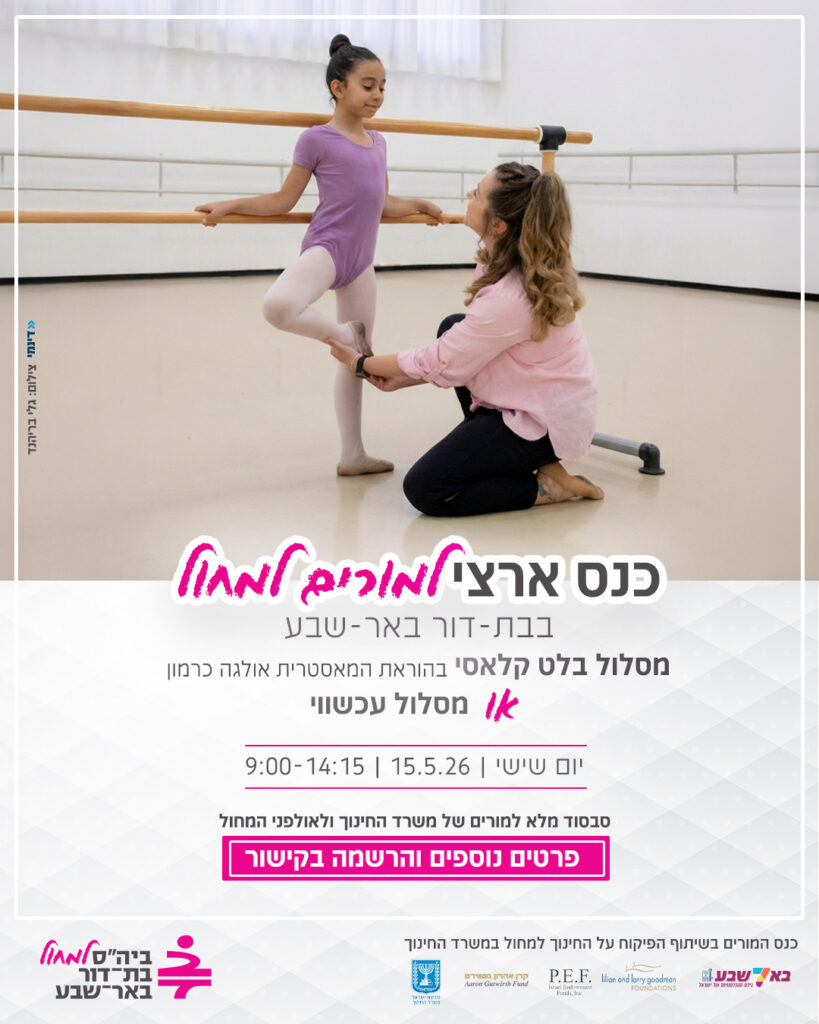 בית הספר למחול בת-דור באר-שבע מזמין אתכם ליום של העשרה מקצועית והשראה ביום שישי ה-15.5.26 בין השעות 09:00-14:15.
